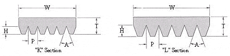 For "K" series belts (most automotive belts) : P = 0.140" (3.56mm), W = No. of Ribs X P, T = 0.235" (5.97mm), H = 0.110" (2.79mm), A = 40 deg.