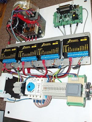 Note the rail system to hold the Gecko drives in the middle, the box around the power supply, fuses for each Gecko, and the controller boards all in their own area. Very nice layout! Mounting those Geckos on a near vertical panel saves a lot of space.