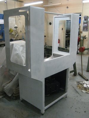 As you can see from the design drawings above, the IH has a pretty good-sized footprint, so I built a largish chip pan for it. The materials are furniture-grade 9/16" plywood (on sale at Home depot, so I couldn't resist picking up 5 sheets of it). Waterproofing will be 3 coats of West Marine Epoxy. This is what the boat builders, who have to deal with a lot more water, use for wooden boats. In addition, I have a fair amount of left over epoxy from my adventures in filling the mill base with epoxy-granite. You want the 3 coats to be rolled on pretty thin.