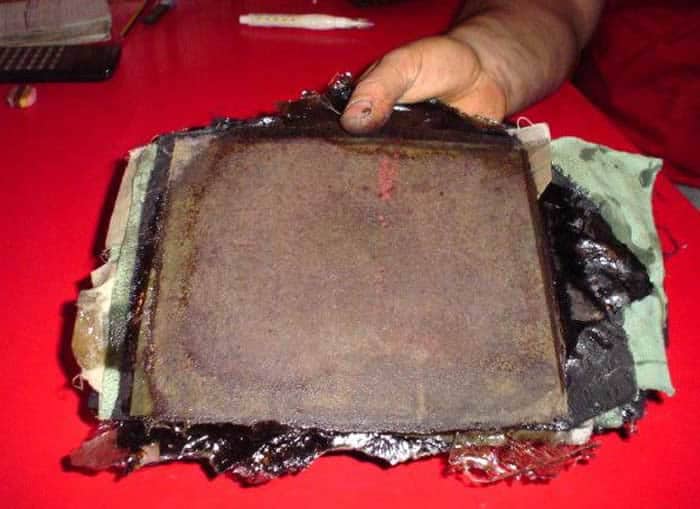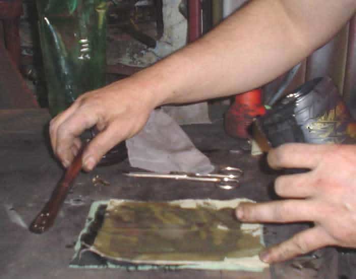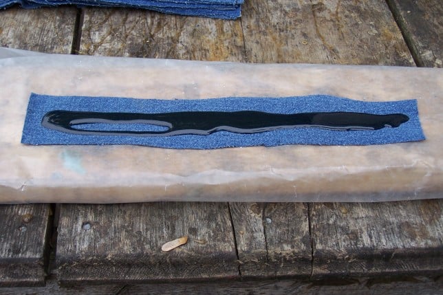 Place between two oiled plates on the press over night. The press gets all the bubbles out and makes the micarta solid as a rock. It comes out looking kinda nasty, eh?