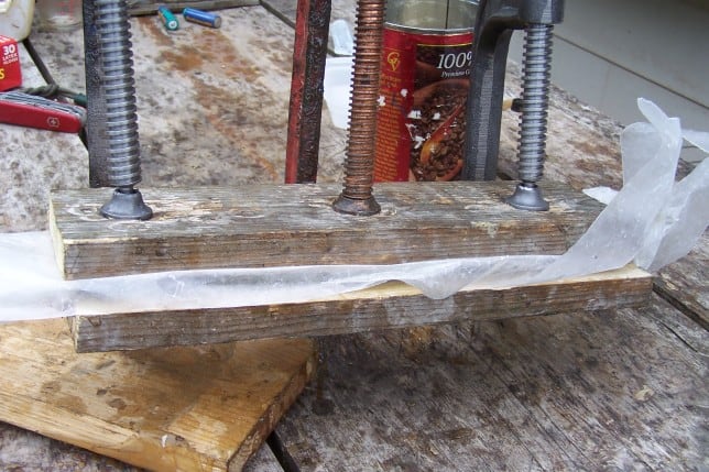 Wax paper and clamped boards while it hardens...