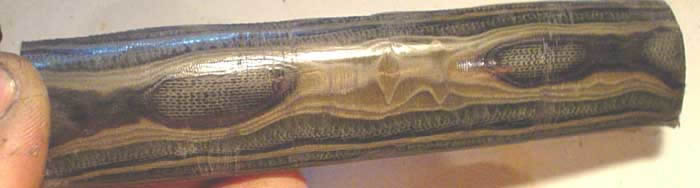 Now work it a bti and you see what's happening. 3 dimension tie dye. A controllable process that produces neat designs for handles and other purposes.